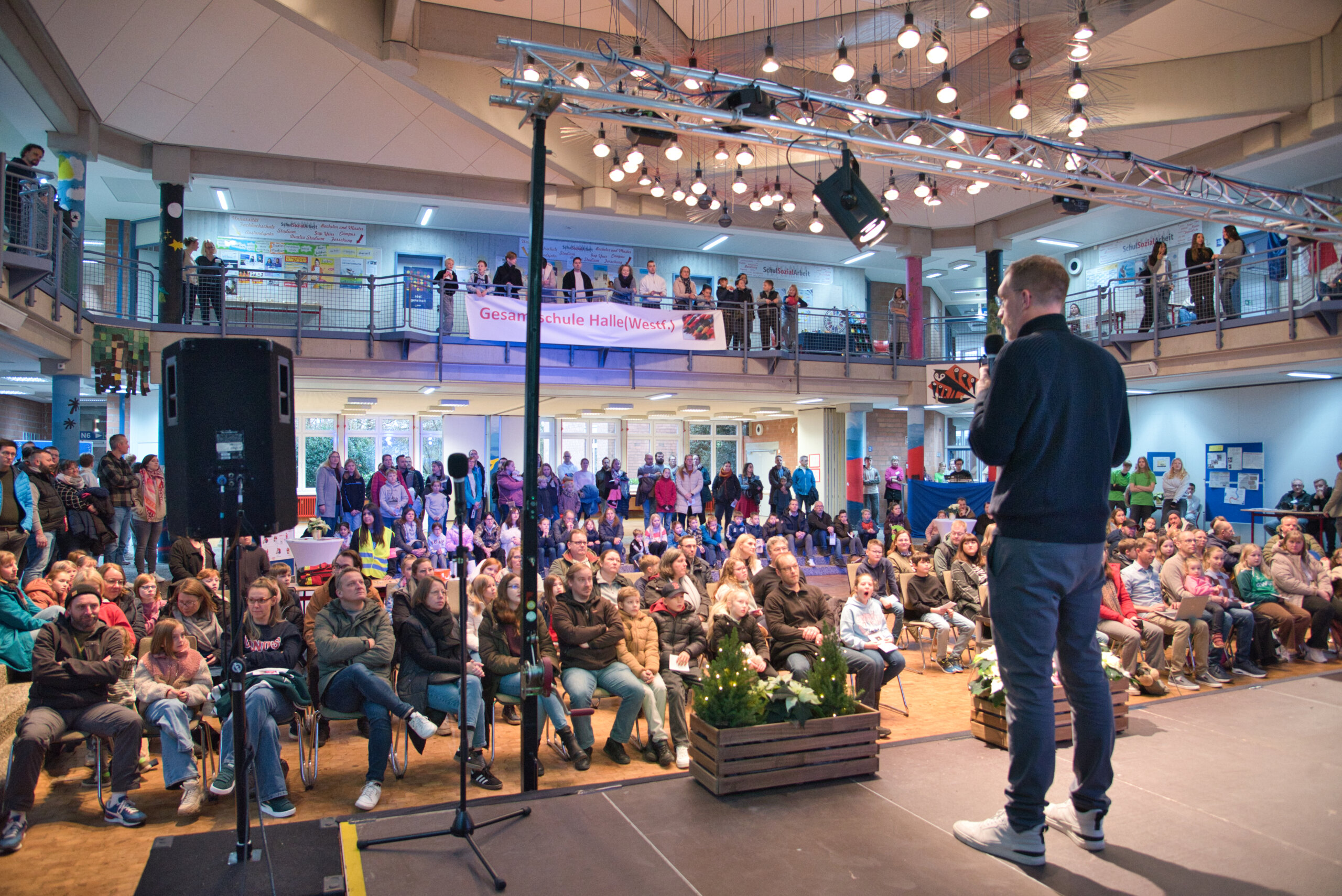 Mit einem eindrucksvollen Tag der offenen Tür hat die Gesamtschule Halle (Westf.) am Samstag zahlreiche Kinder, Eltern und Interessierte empfangen. Das Pädagogische Zentrum (PZ) war bis auf den letzten Platz gefüllt, als Schulleiter Matthias Geukes die Gäste begrüßte und die Grundsätze der Schule vorstellte: Wohlfühlen, wachsen, wirksam sein.