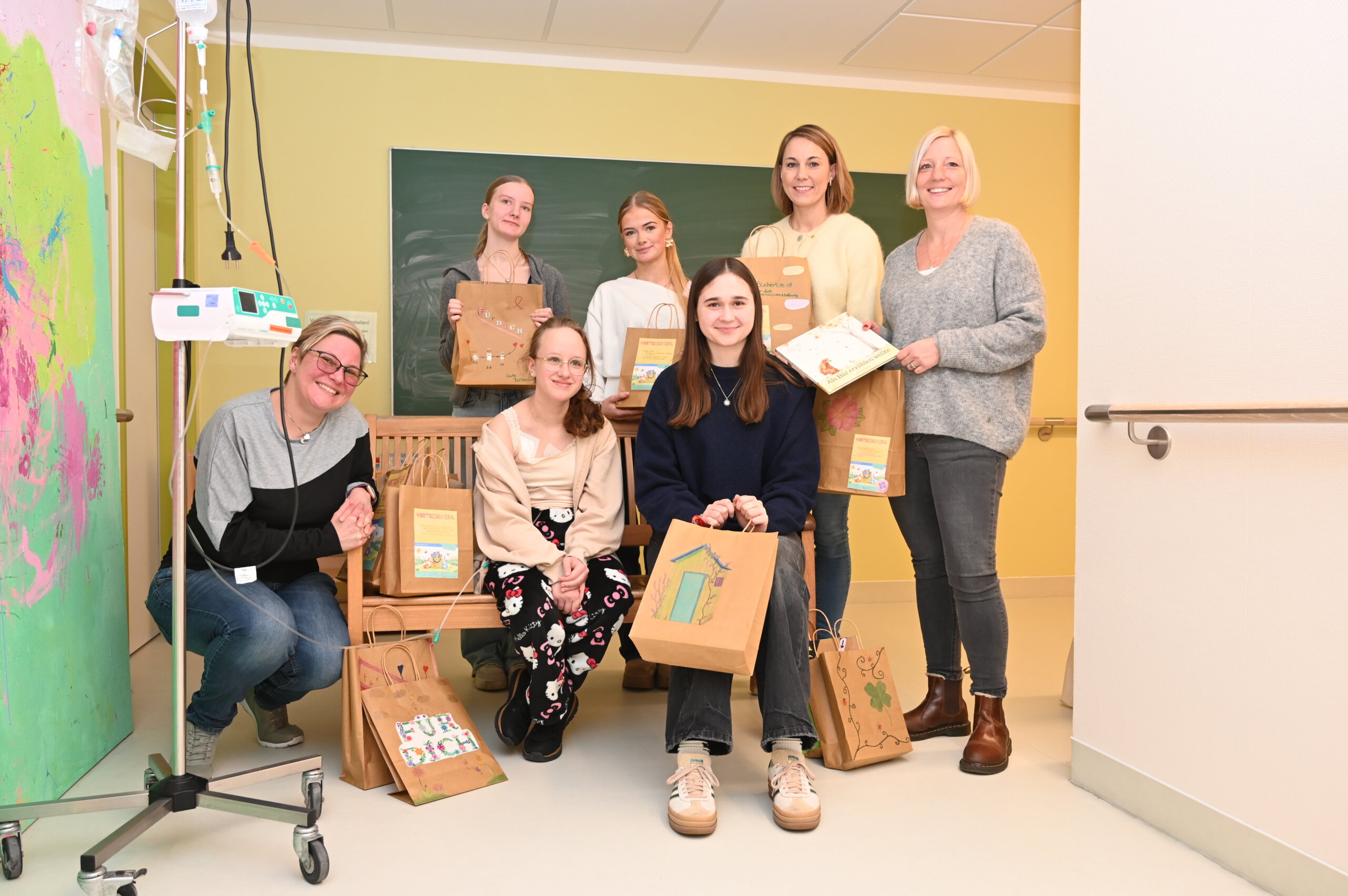 Die fertigen „Wortgeschenke“ wurden anschließend persönlich übergeben – liebevoll zusammengestellt mit selbst produzierten Glücksbringern, Mutmach-Botschaften und Spielen. Die Büchertüten sind dabei so konzipiert, dass die Geschichten per QR-Code unkompliziert abrufbar sind. Gerade für Kinder, die durch Therapien geschwächt sind oder sich nur schwer konzentrieren können, entsteht so eine niedrigschwellige Möglichkeit, in andere Welten einzutauchen und für einen Moment Abstand vom Klinikalltag zu gewinnen.